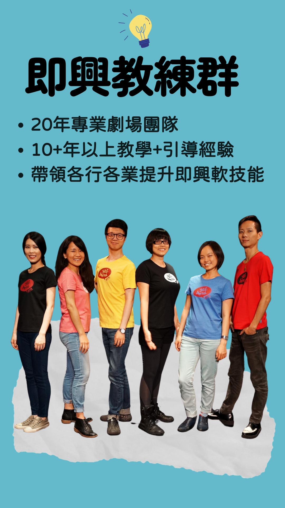 勇氣即興的即興教練們,是一群身經百戰、台灣最資深的專職即興劇工作者,平均15年豐富的即興劇表演經驗,演出過最多元形式的即興劇,平均10年以上教學經驗,帶領過各領域各年齡層的學員,並受過正式的引導訓練。