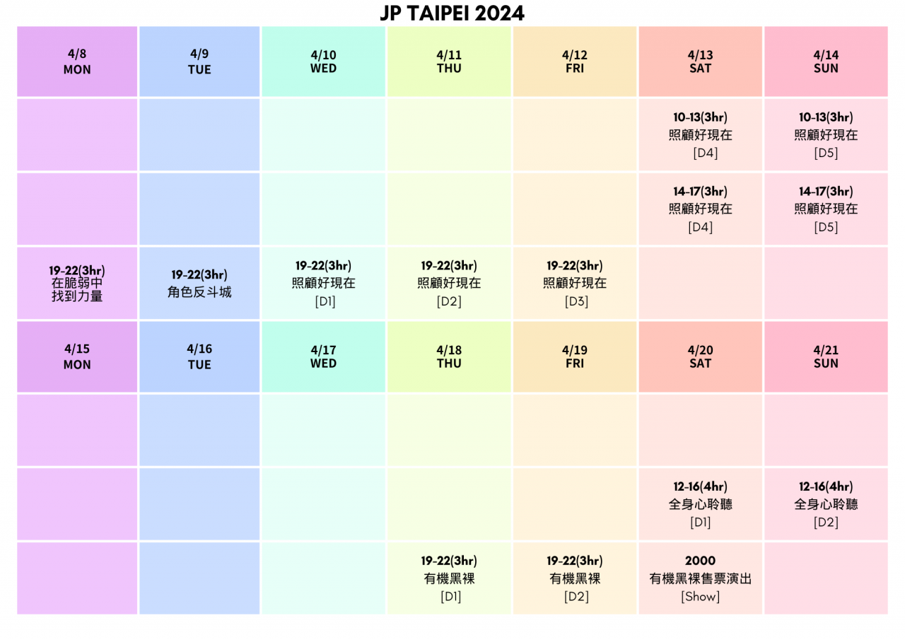 JP系列工作坊,教練將以英語帶領,全程搭配勇氣即興提供的現場中英文口譯,演員以中文練習及表演。