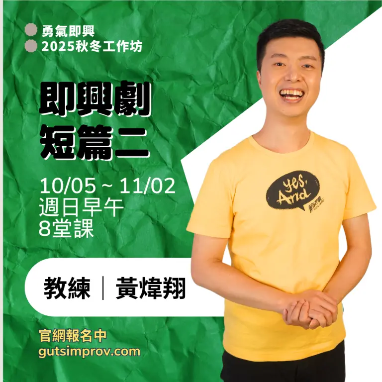 即興劇短篇一 結業學員 [工作坊分級](二年內曾上過勇氣即興開辦之–即興劇短篇一工作坊之結業學員,若你不確定自己是否符合資格,請跟我們聯絡!guts@gutsimprov.com)