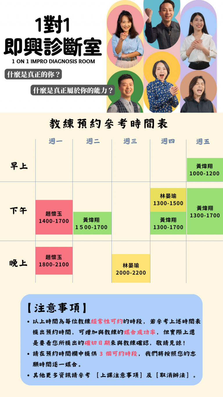 若您對於【1對1即興教練課】有興趣,您可以預約一次【即興診斷室】做為【1對1即興教練課】的對焦時間,請在下單前勾選您的意願,讓教練知道。