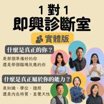 指定一位勇氣即興教練擔任即興劇個人教練,依學員每次的需求,透過視訊進行線上教練工作,包括:即興能力的個人教練,以及依學員需求所提供的顧問服務,例如:即興劇課程帶領的教學顧問。